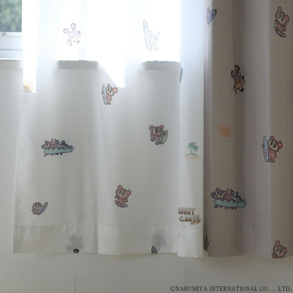 日焼けしたエンジェルブルーの仲間たちが、サーフィンを楽しむ姿をさりげなく描いたレースカーテン。