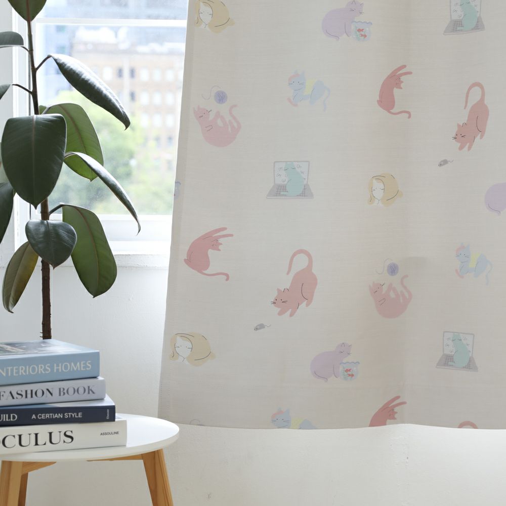 イタズラ好きなネコたちが散りばめられた、可愛らしいデザインのドレープカーテンです。 ネコたちがあちこちで遊んでいる様子が描かれ、見ているだけで微笑ましくなるデザインです。 ユニークでリズミカルなネコたちの姿が、お部屋に温かみと楽しさをプラス。 ペット好きやユニークなインテリアがお好きな方にぴったりなカーテンです。 レースカーテン【モチネコ】とのコーディネートもおすすめです。