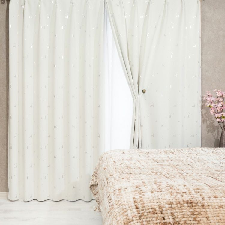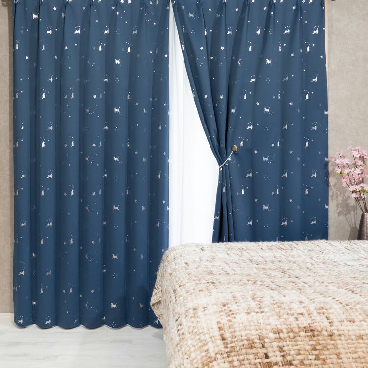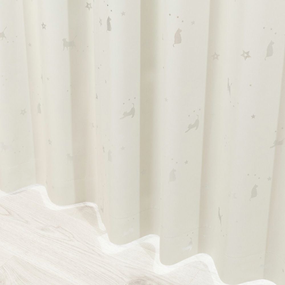まるでプラネタリウムにいるような猫と星がシルバーの箔でプリントされたデザイン。のびのびとした猫が自由に描かれており、角度を変えると箔の部分がきらっと輝きます。 ご家庭での洗濯も可能なため、長く清潔にお使いいただけます。 色ごとに遮光等級が異なります。 アイボリー:遮光2級 ネイビー:遮光1級 同柄のレースカーテン【ステラキャットレース】とのコーディネートもおすすめです。