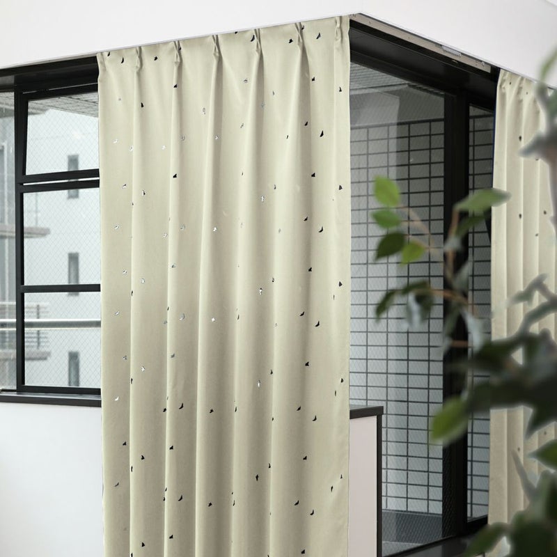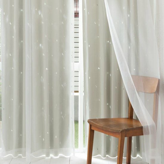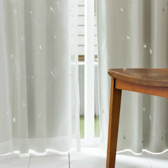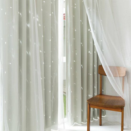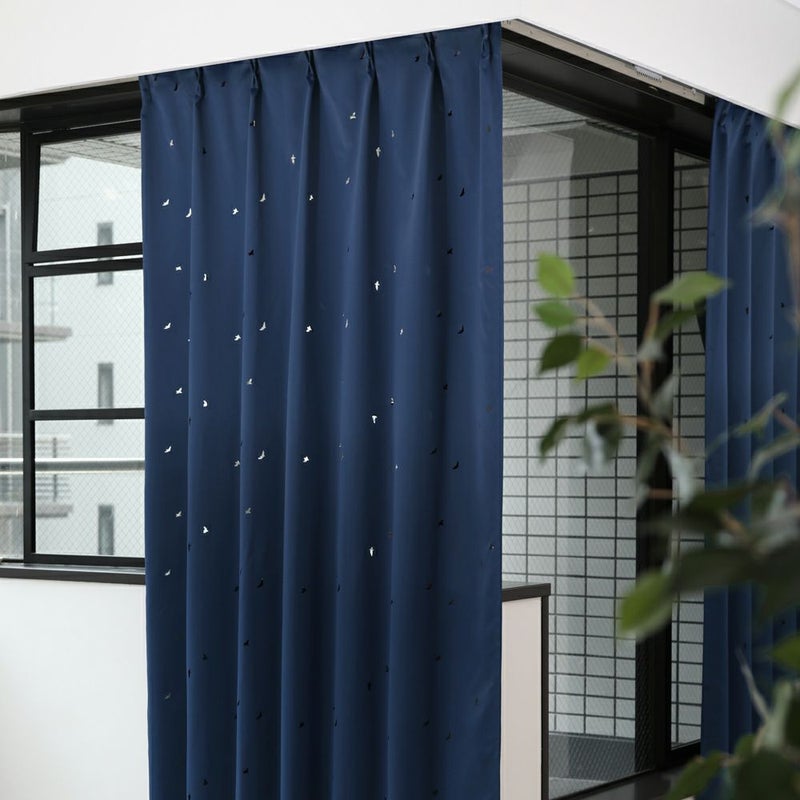 レーザーカット加工で小鳥の形が透かし彫りされたカーテンです。切り抜かれた小鳥の形から外の光が差し込み、まるでライトアップされたような雰囲気になります。 防炎機能付き。ご家庭での洗濯も可能なため、長く清潔にお使いいただけます。 ※レースカーテンは別売りです。