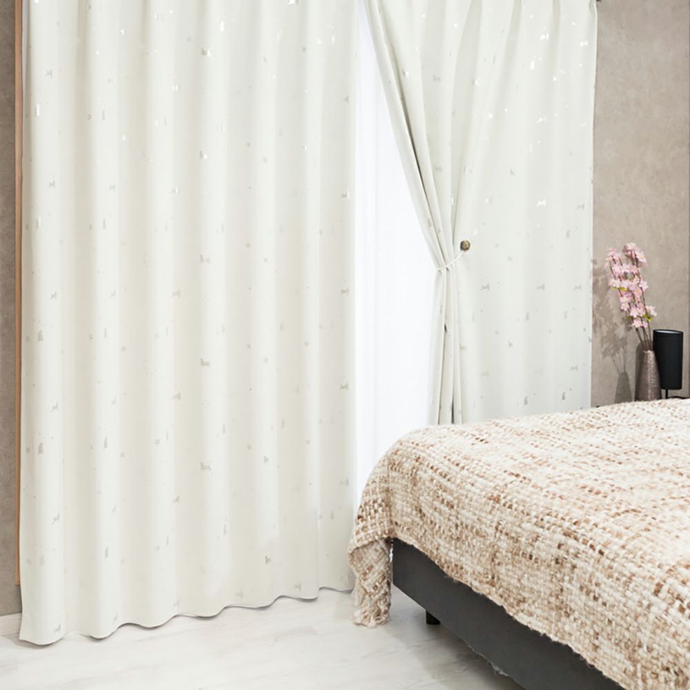 まるでプラネタリウムにいるような猫と星がシルバーの箔でプリントされたデザイン。のびのびとした猫が自由に描かれており、角度を変えると箔の部分がきらっと輝きます。 ご家庭での洗濯も可能なため、長く清潔にお使いいただけます。 色ごとに遮光等級が異なります。 アイボリー:遮光2級 ネイビー:遮光1級 同柄のレースカーテン【ステラキャットレース】とのコーディネートもおすすめです。