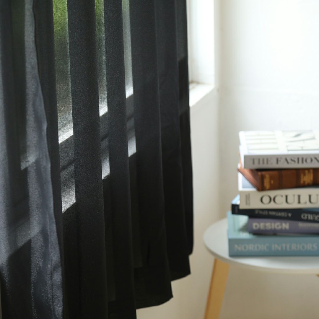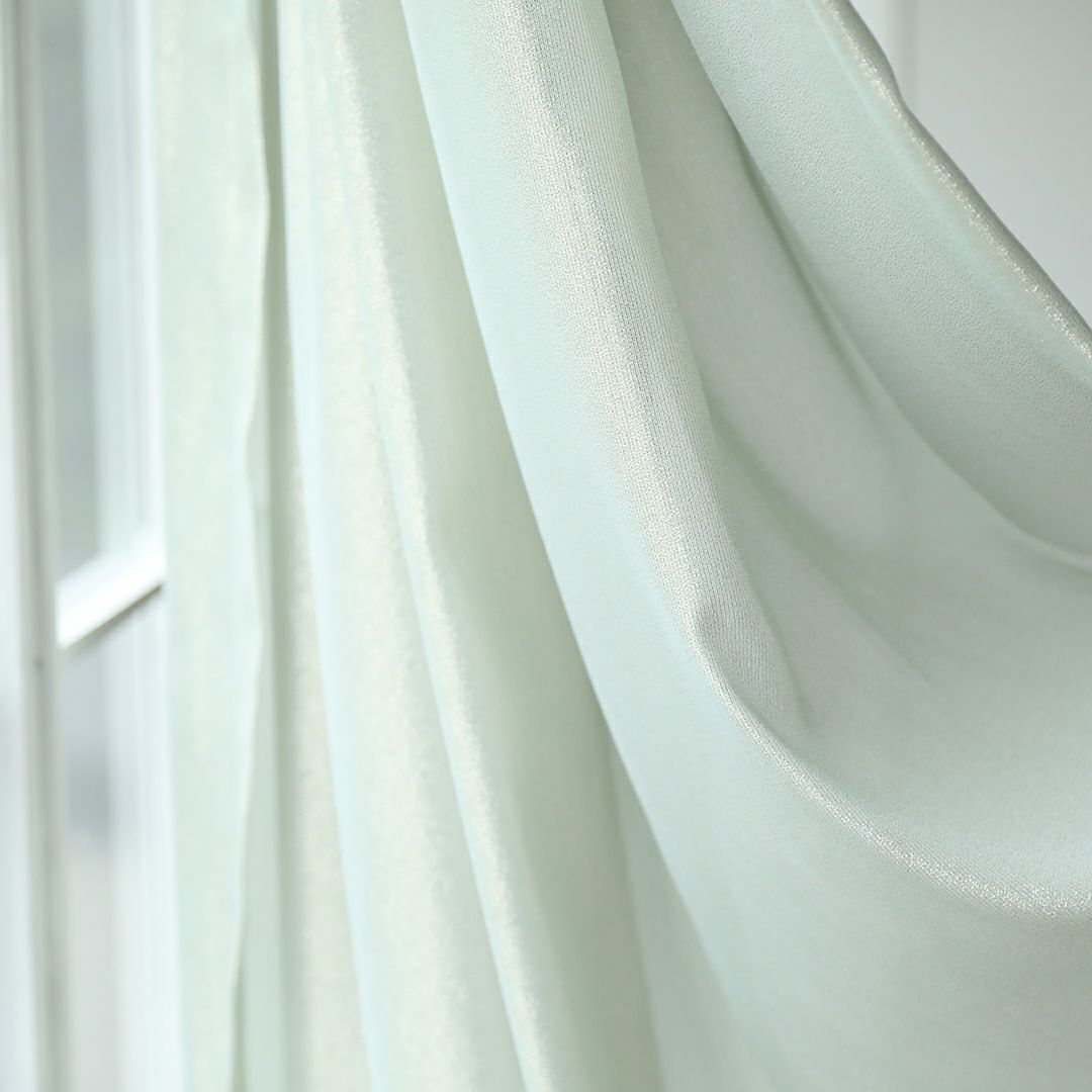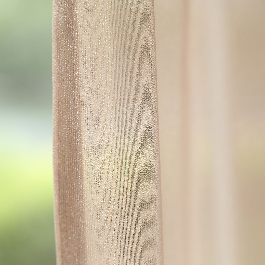 シルバーとゴールドのラメ糸を交互に配列したラメストライプのジョーゼット生地です。 落ち感があり、ドレープ性のある風合いと、ラメの華やかで高級感のある光沢が特徴です。 光に当てるとラメ糸が表情豊かにキラキラと輝きます。 生地は柔らかく、とろみのある質感です。 ご家庭での洗濯も可能なため、長く清潔にお使いいただけます。見る角度や生地の重なりによって異なる様々な表情を、是非お部屋でお楽しみください。