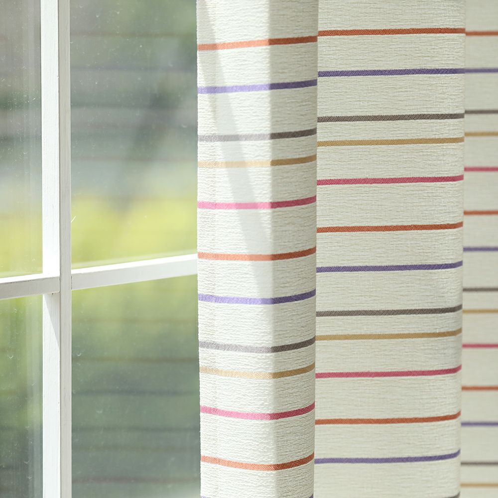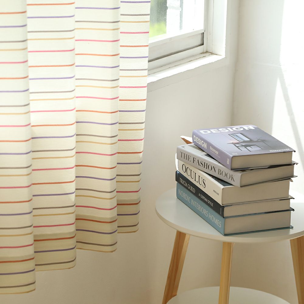 5色のカラフルな色のボーダーをデザイン。 どこか懐かしい印象のレトロポップなデザインです。 光を柔らかく取り入れる生地なので、太陽の光を取り入れた健康的な生活をしたい方におすすめです。 ご家庭での洗濯も可能なため、長く清潔にお使いいただけます。