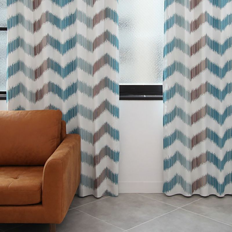線描きされた大胆なシェブロン柄。色がグラデーションにデザインされています。シンメトリーに色が切り替わる柄なので、左右の見る角度によって見え方が変わります。 遮光2級の機能付き。ご家庭での洗濯も可能なため、長く清潔にお使いいただけます。