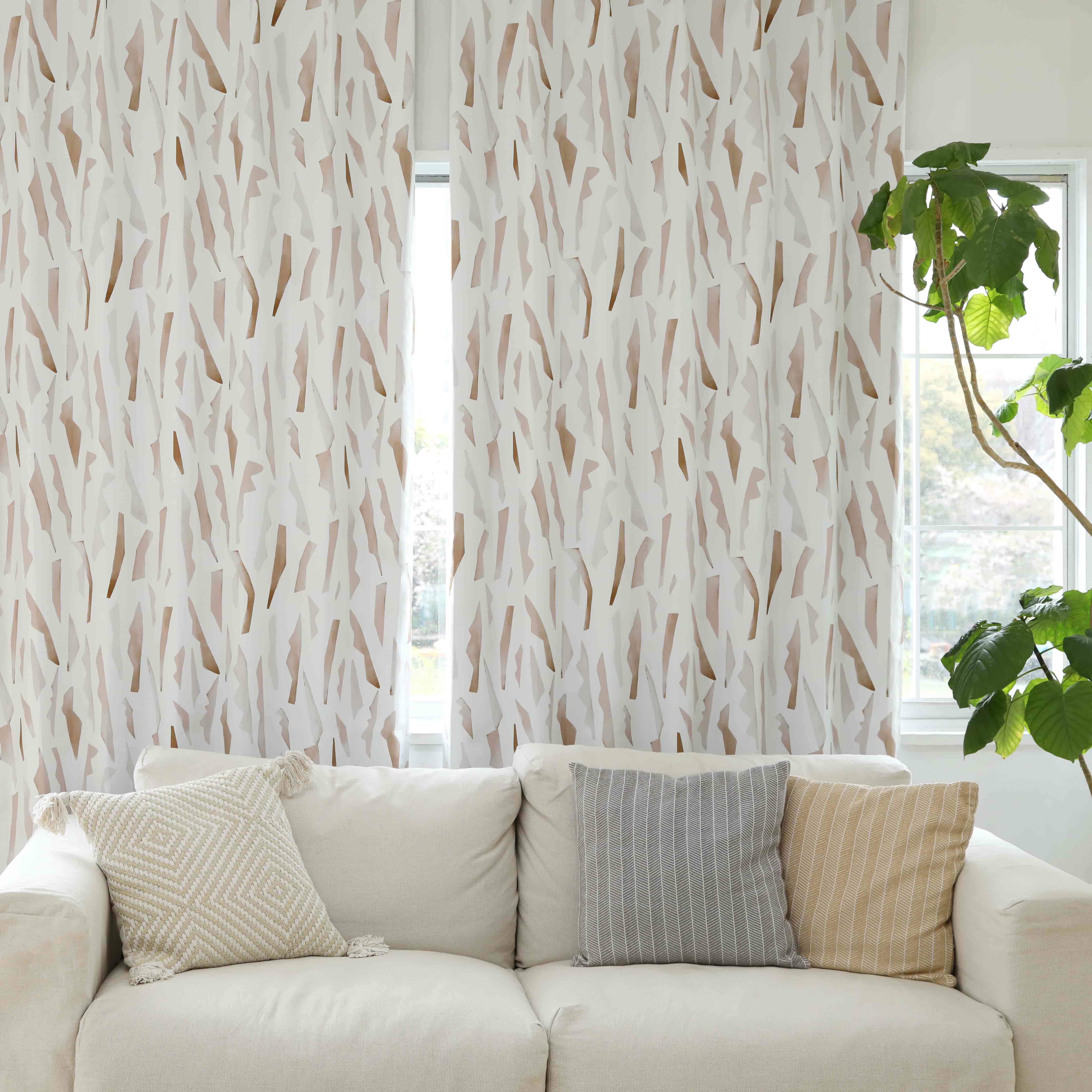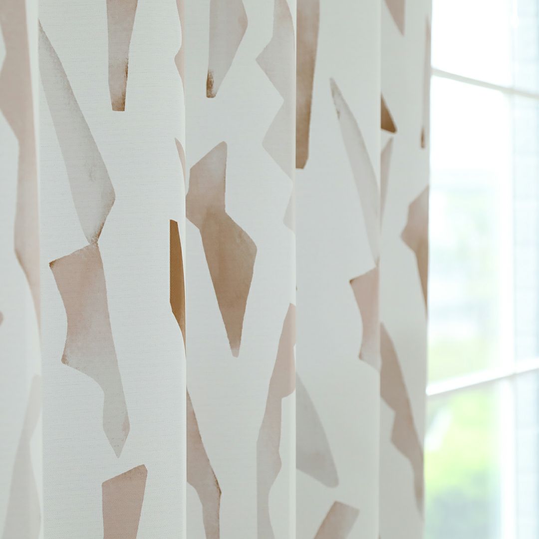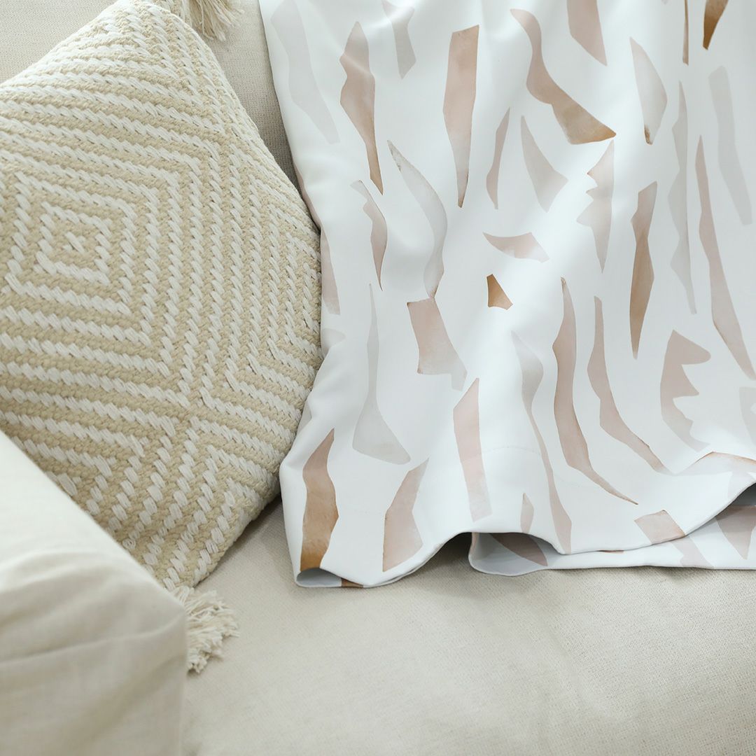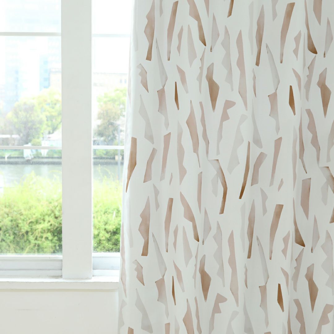 柔らかな色合いで水彩画風に描かれた幾何学柄のカーテンです。 ベージュ・ブラウン系の優しい色でデザインされているため、ナチュラル系のお部屋との相性抜群です。 ベニークのテキスタイルデザイナーによるオリジナルプリント柄。ここでしか買えない限定商品です。 ご家庭での洗濯も可能なため、長く清潔にお使いいただけます。
