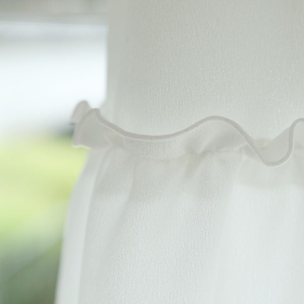 切り替え部分には細かくフリルを入れているので、ふわふわと裾が広がり、柔らかな雰囲気に仕上げました。