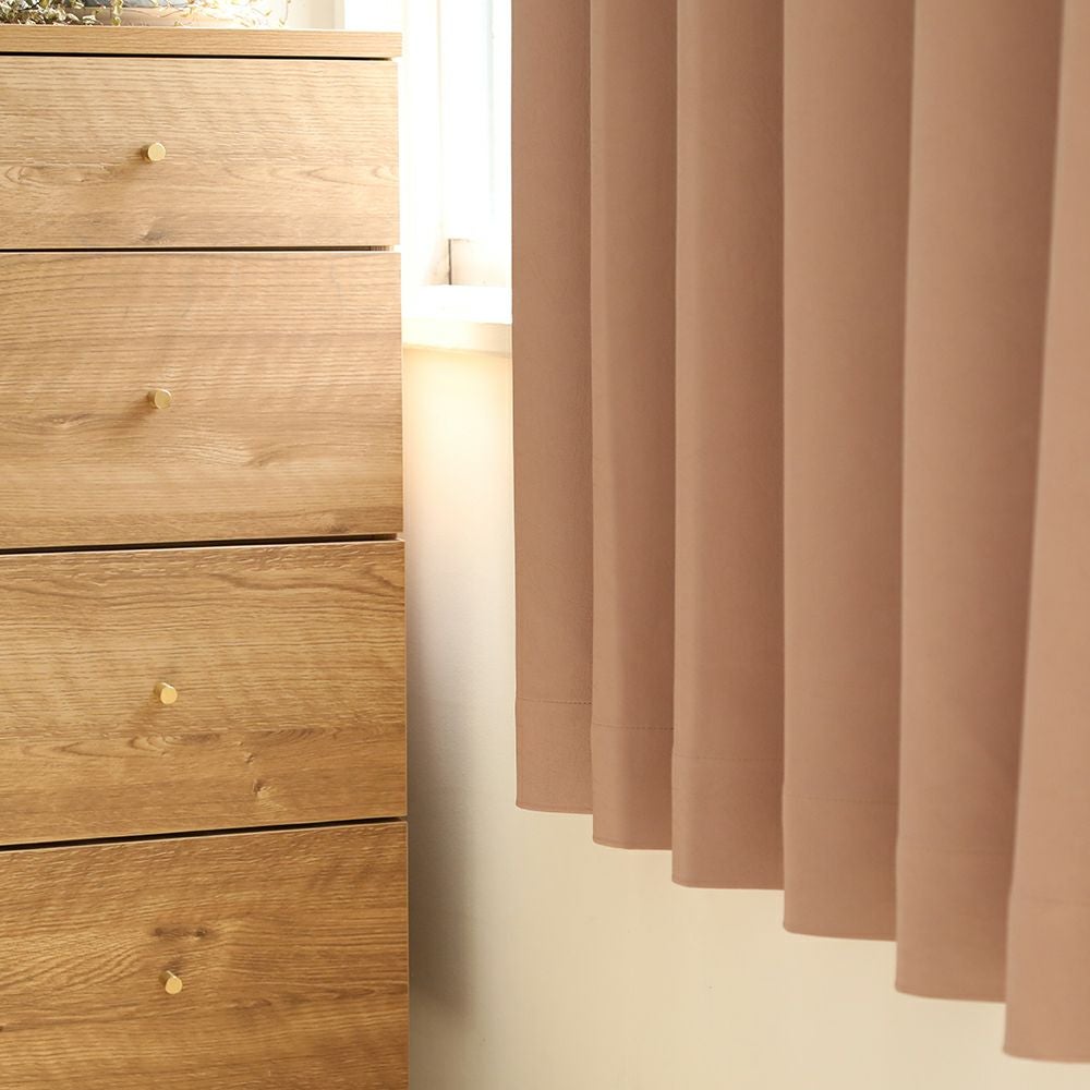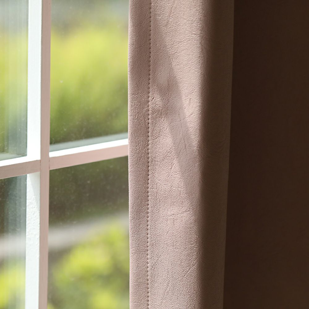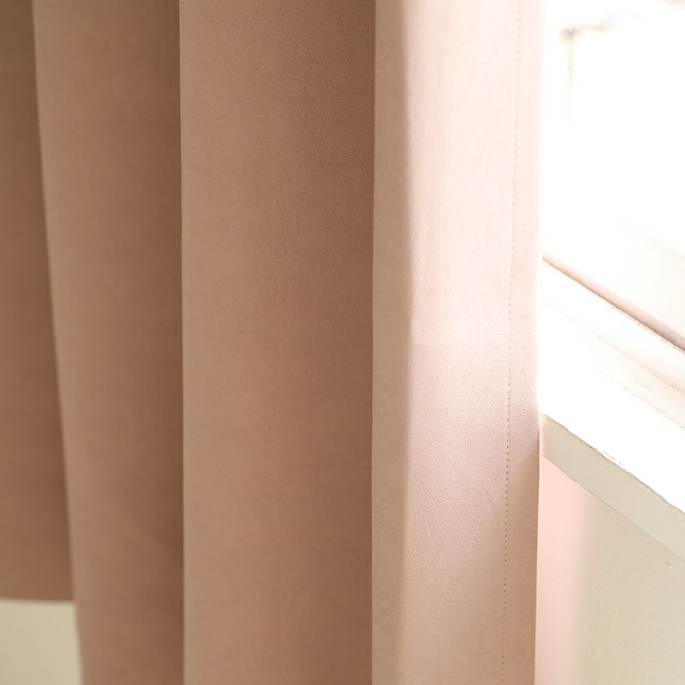 レザータッチのカジュアルな印象のカーテンです。 シボ感のあるしっかりとした手持ち感のある生地を使用しています。 ピンクベージュの柔らかな色合いがお部屋を柔らかく彩ります。 1級遮光機能付き。ご家庭での洗濯も可能なため、長く清潔にお使いいただけます。
