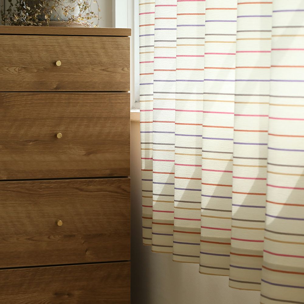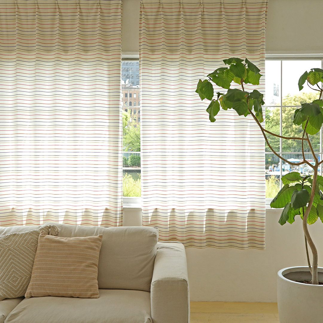 5色のカラフルな色のボーダーをデザイン。 どこか懐かしい印象のレトロポップなデザインです。 光を柔らかく取り入れる生地なので、太陽の光を取り入れた健康的な生活をしたい方におすすめです。 ご家庭での洗濯も可能なため、長く清潔にお使いいただけます。