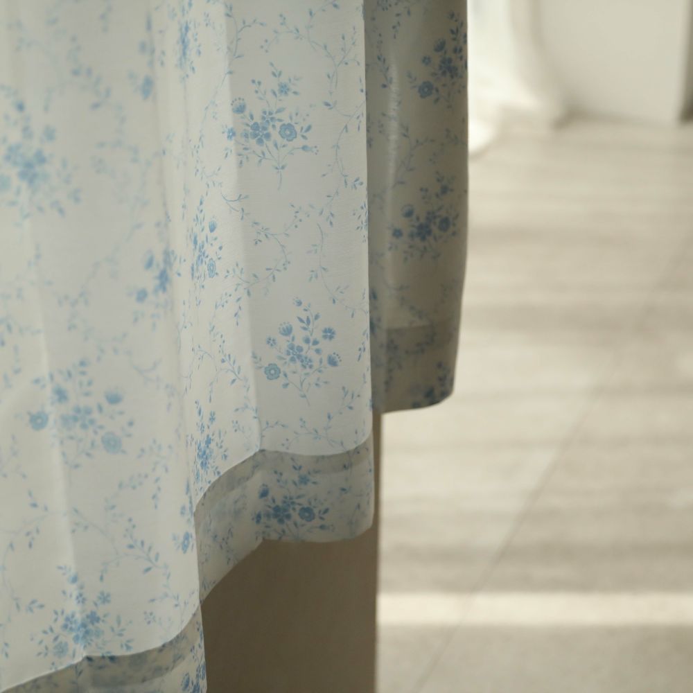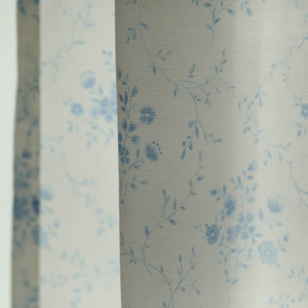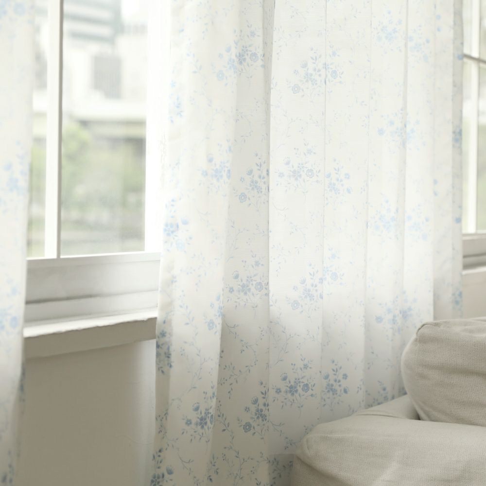 ブルーの濃淡で描かれたお花のブーケのデザイン。 流れるようなツタ柄が上品な雰囲気を演出します。 淡い色味で描いているので、お部屋の雰囲気をほのかに可憐に演出します。 VENIRCでしか買えない特別なデザインです。 ご家庭での洗濯も可能なため、長く清潔にお使いいただけます。 同柄の厚地カーテン【コフル】もご用意しております。