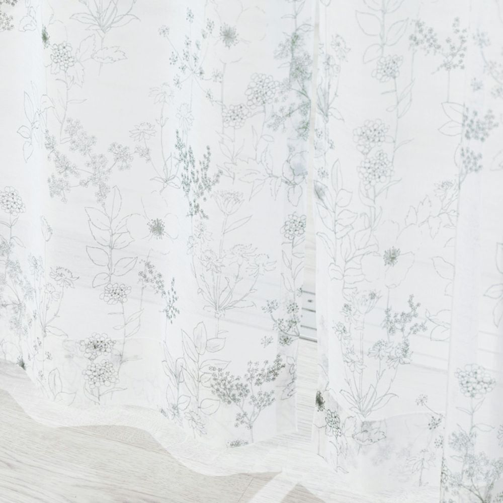 自然な質感の生地の上に繊細な線でデザインされた草花柄レースカーテン。ご家庭での洗濯も可能なため、長く清潔にお使いいただけます。同柄の厚地カーテン【フローラ】と合わせるコーディネートもおすすめ。