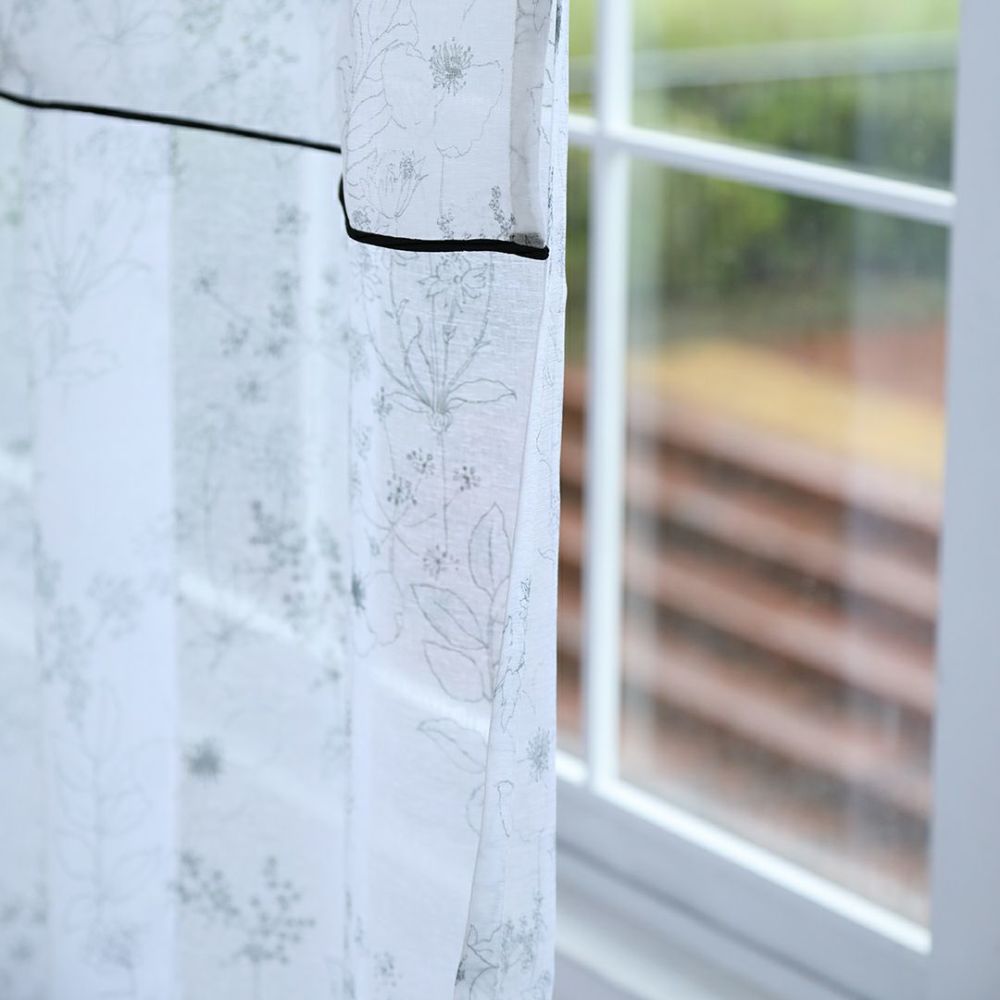 自然な質感の生地の上に繊細な線でデザインされた草花柄レースカーテン。