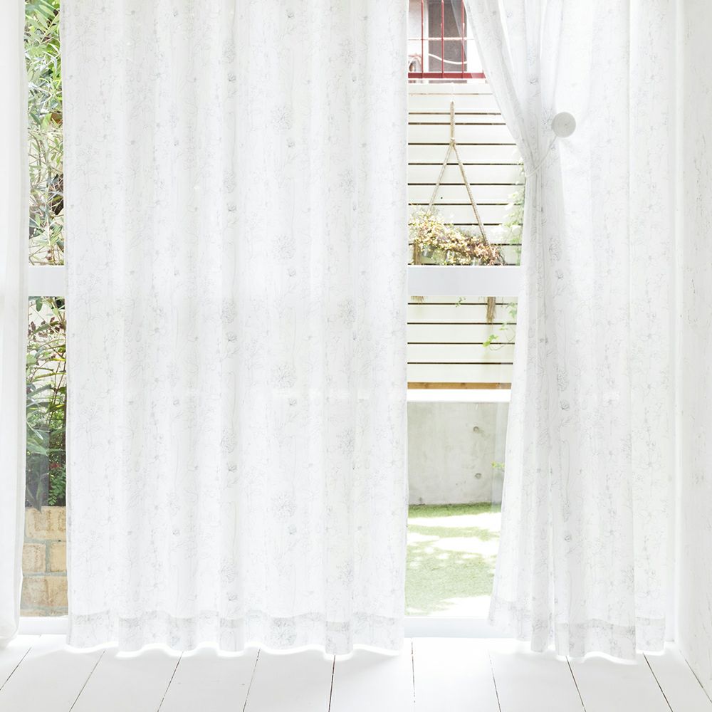 手描き調のボタニカル柄の中に、猫たちが遊んでいるように隠れているプリントカーテン。ナチュラルな雰囲気を演出します。ご家庭での洗濯も可能なため、長く清潔にお使いいただけます。 同柄の厚地カーテン【キティン】とのコーディネートもおすすめです。