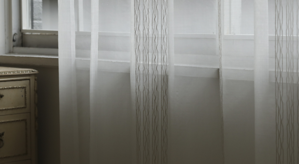 天然素材を思わせるやさしい風合いのベースに、ホワイトとグレーを組み合わせたストライプ柄をデザインしたレースカーテン。