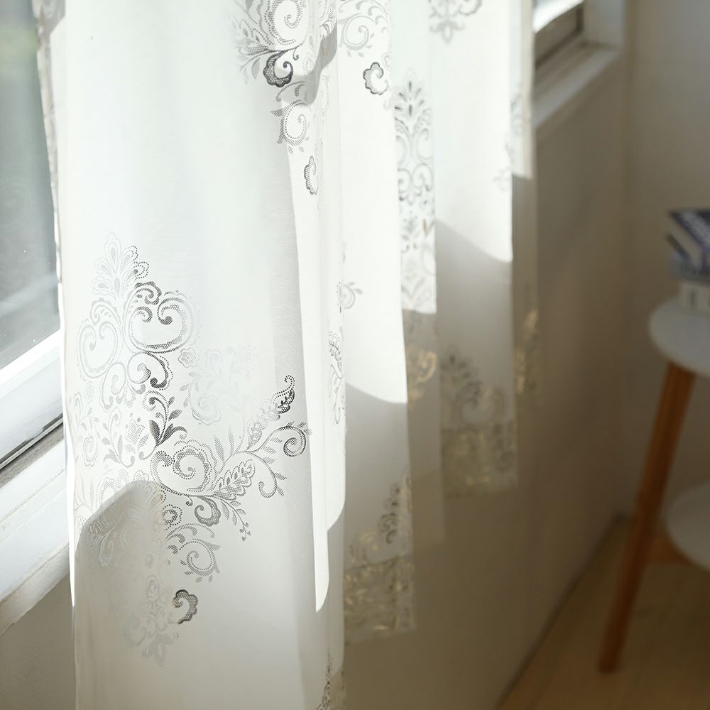 オーナメント柄をシルバーの箔でプリントした上品な雰囲気のカーテンです。 手持ち感の良いしっかりとした生地を使用しています。 風になびくと箔の部分がさりげなく輝き、上質な空間を演出します。 モノトーン系のカーテンとの組み合わせも相性抜群です。 ご家庭での洗濯も可能なため、長く清潔にお使いいただけます。