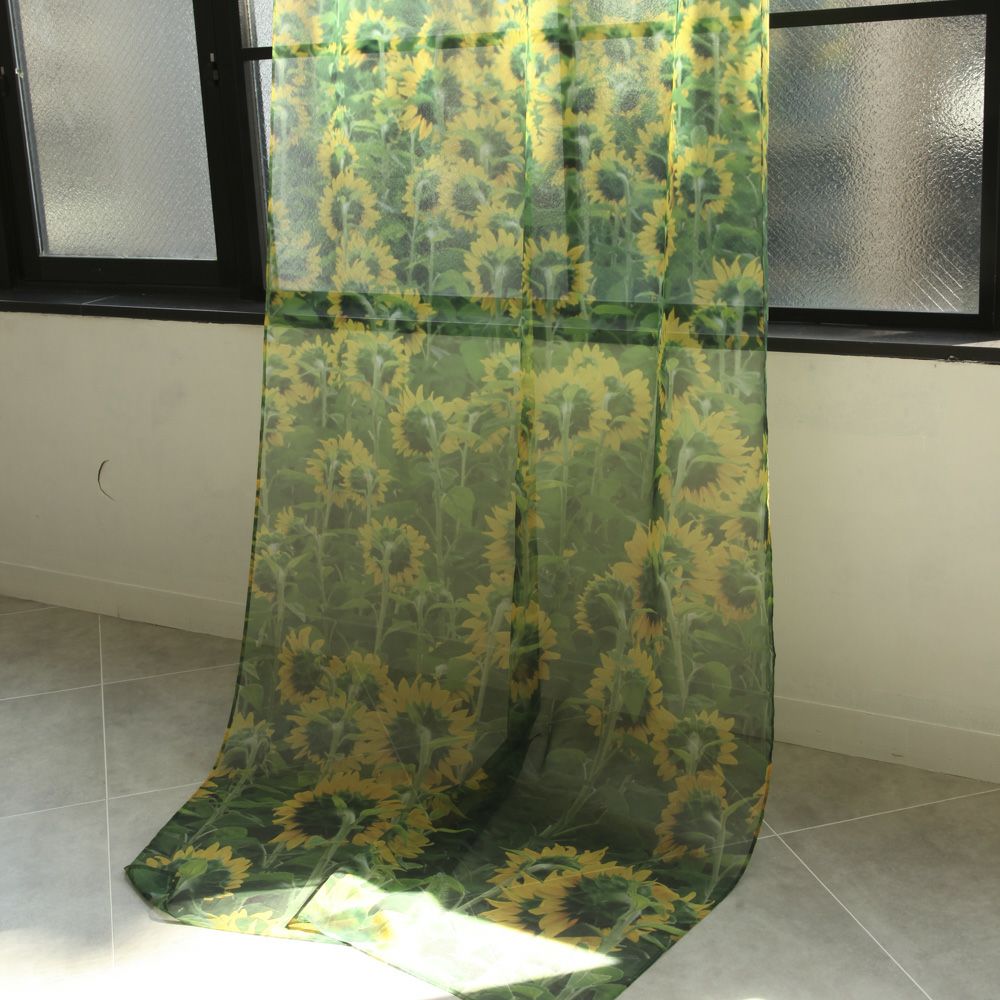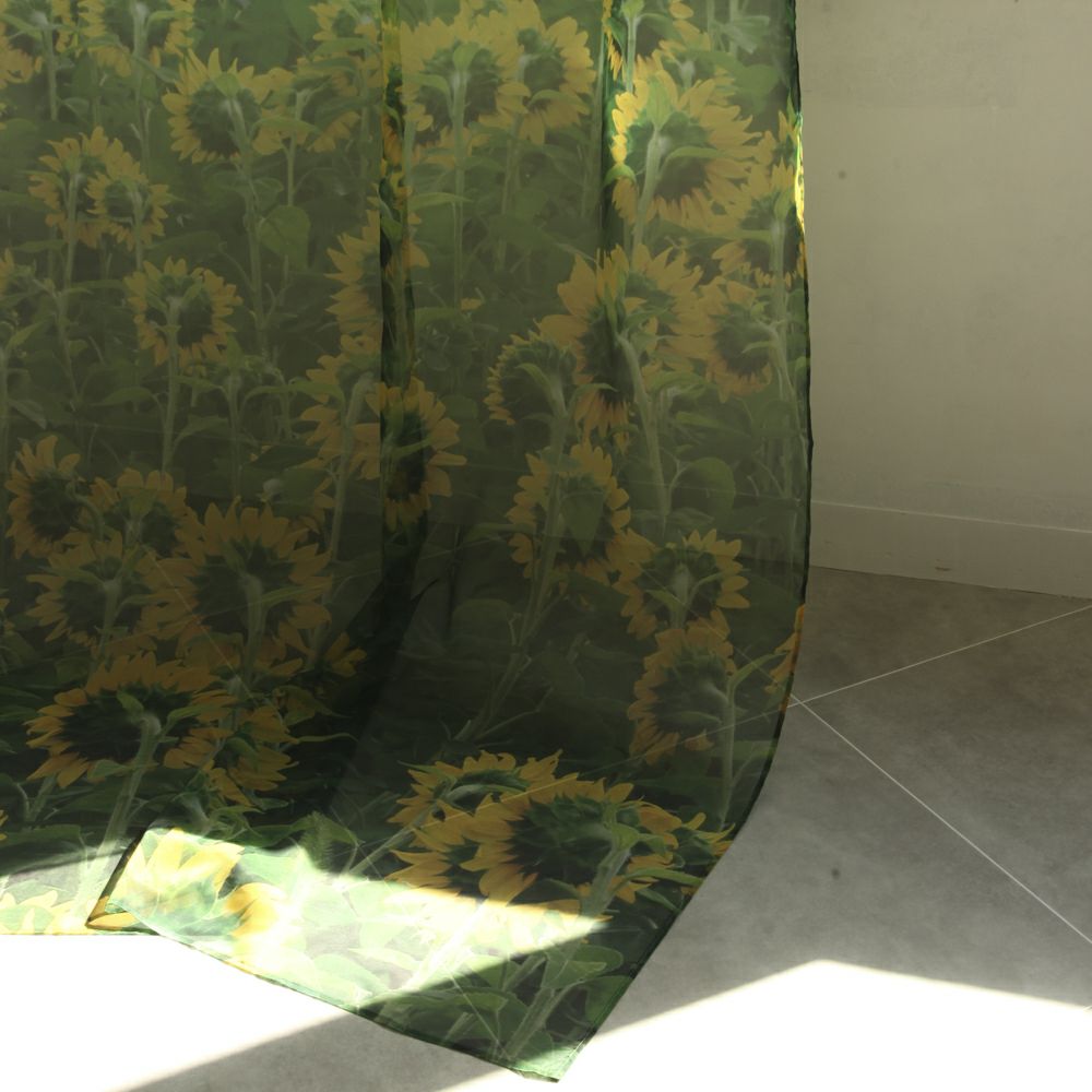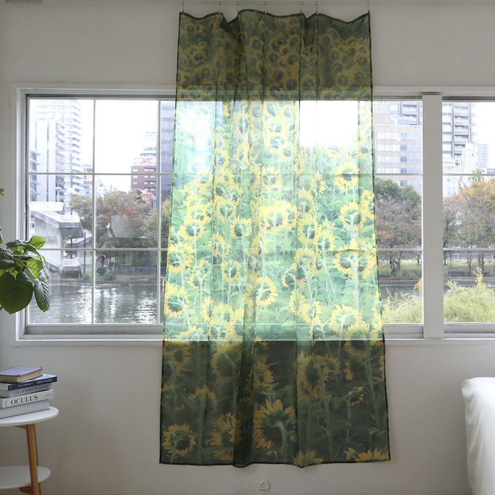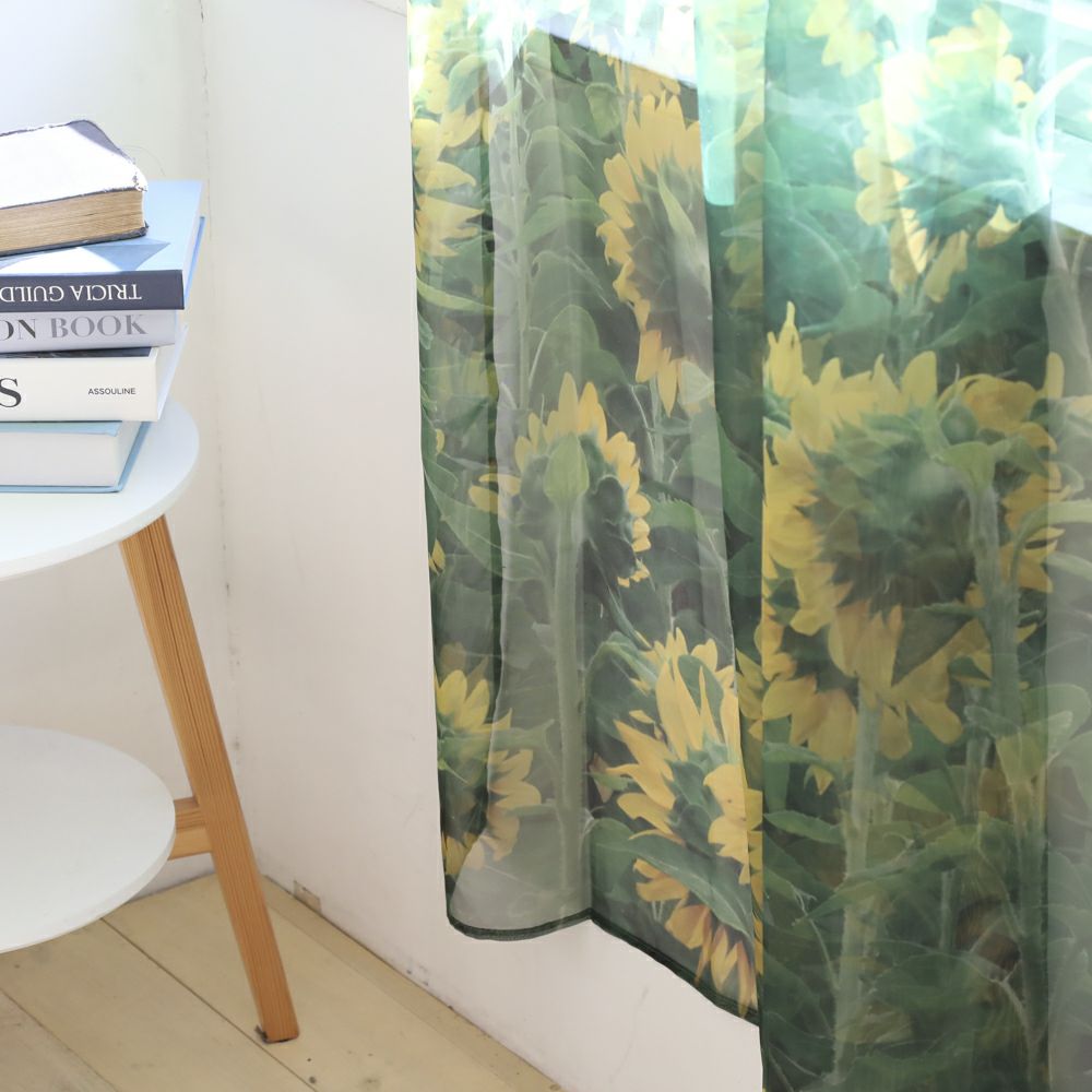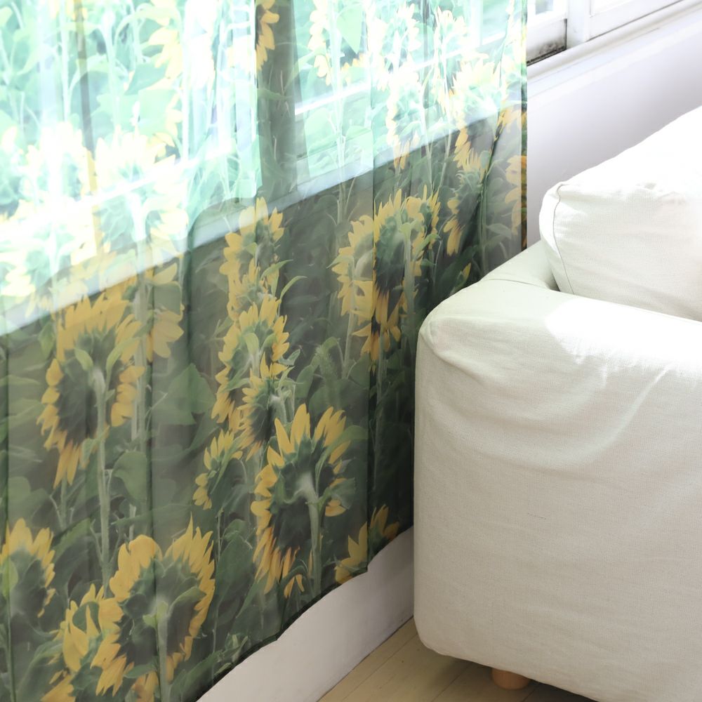 一面に広がるひまわりの「背中」が織りなす、不思議な窓辺の光景。