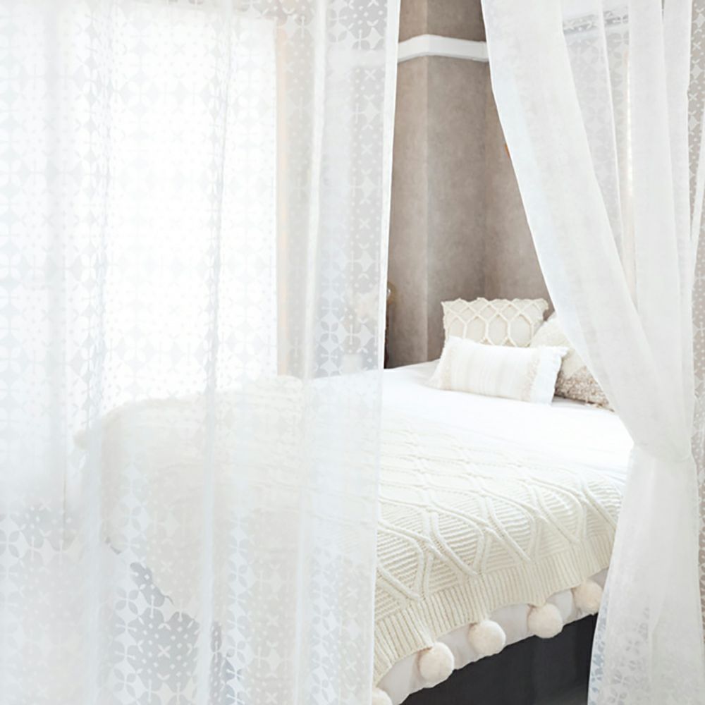 オパール加工という技法で、生地が部分的に透けるよう加工された透け感のあるレースカーテン。透けた箇所から差し込む光と、透けない箇所が床へ作り出す影も綺麗です。タイルを並べたようなナチュラルで清潔感のある柄が魅力的。ご家庭での洗濯も可能なため、長く清潔にお使いいただけます。