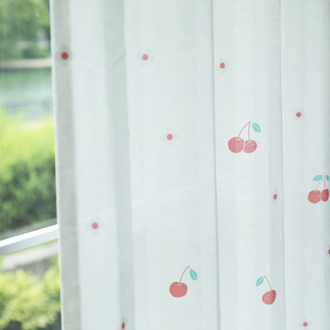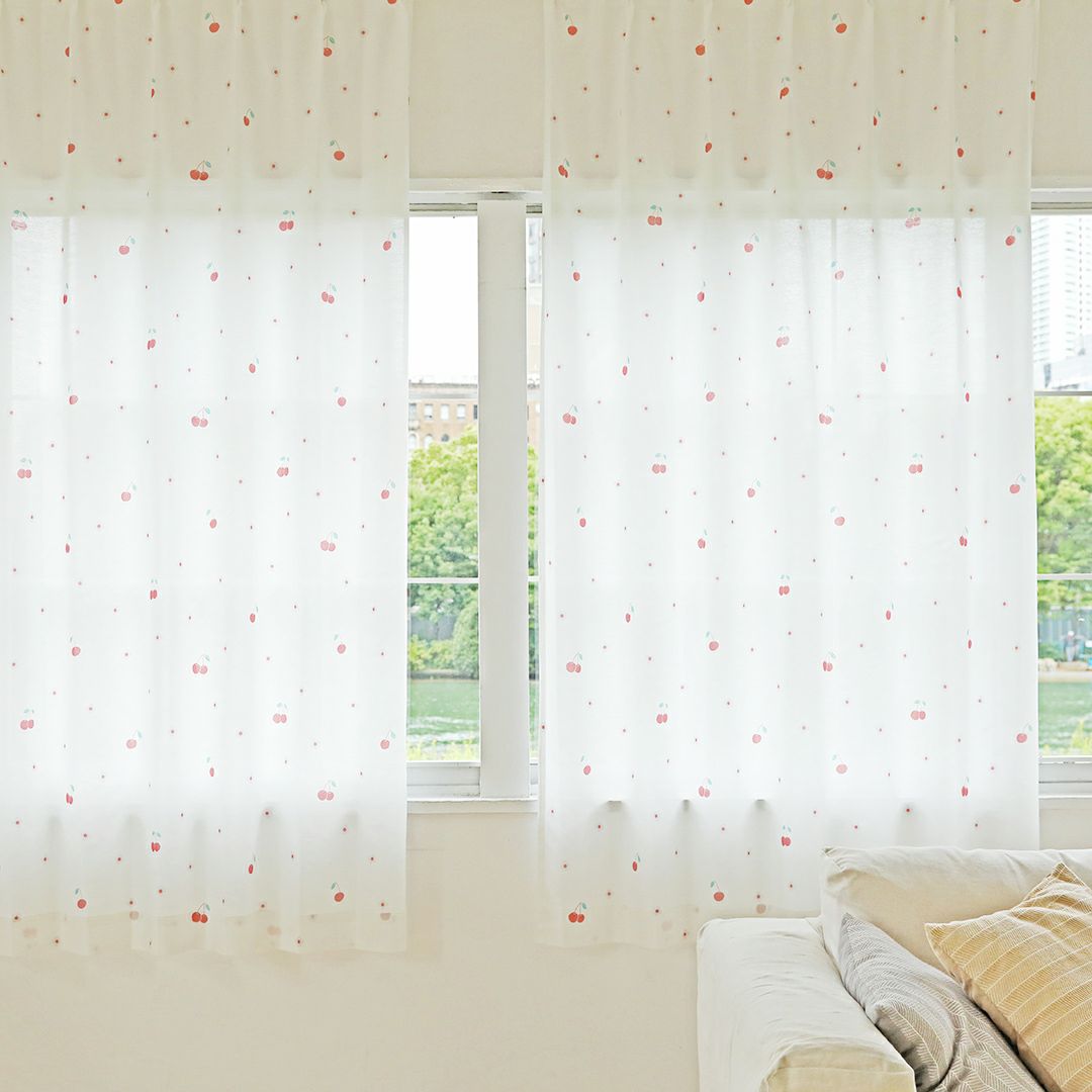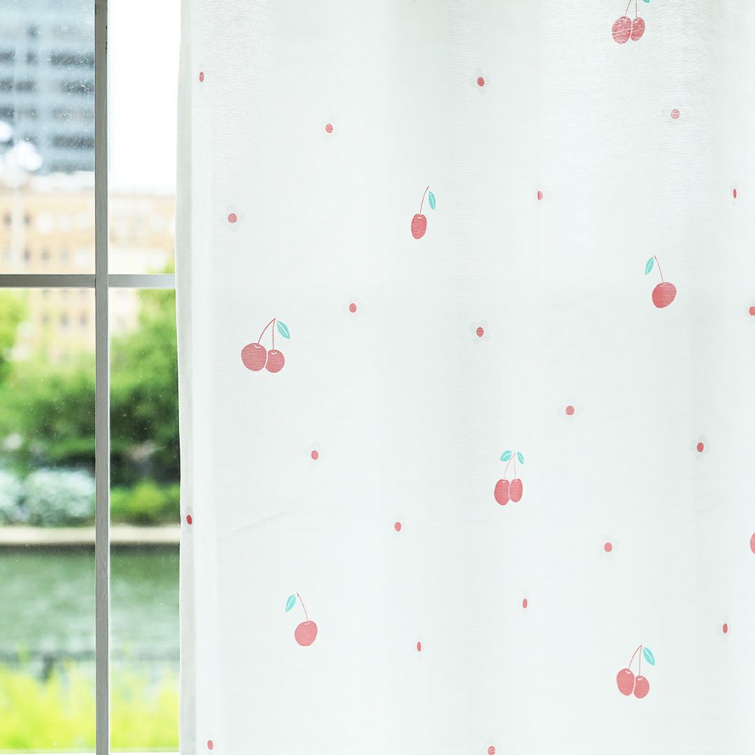 ポップで可愛いチェリーとお花をデザインしました。 リビングなどの大きな窓にはもちろん、小窓や出窓などの小さいサイズの窓にもチェリーの赤が良いアクセントになり、とても可愛く吊っていただけます。 赤系のドレープカーテンとの同色系統一コーディネートや、編みレースカーテンと合わせた、レトロ風コーディネートもおすすめです。 当店デザイナーによるオリジナル柄のため、VENIRC限定の特別なデザインです。 ご家庭での洗濯も可能なため、長く清潔にお使いいただけます。