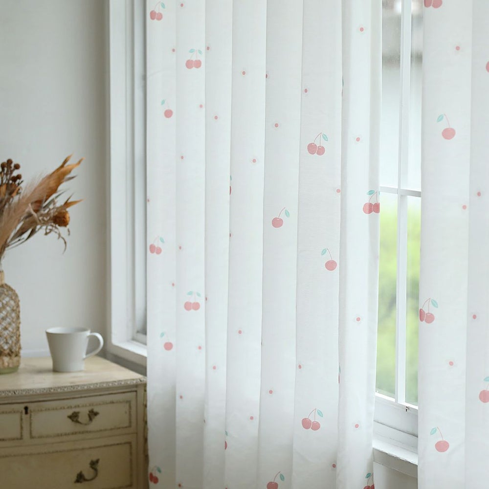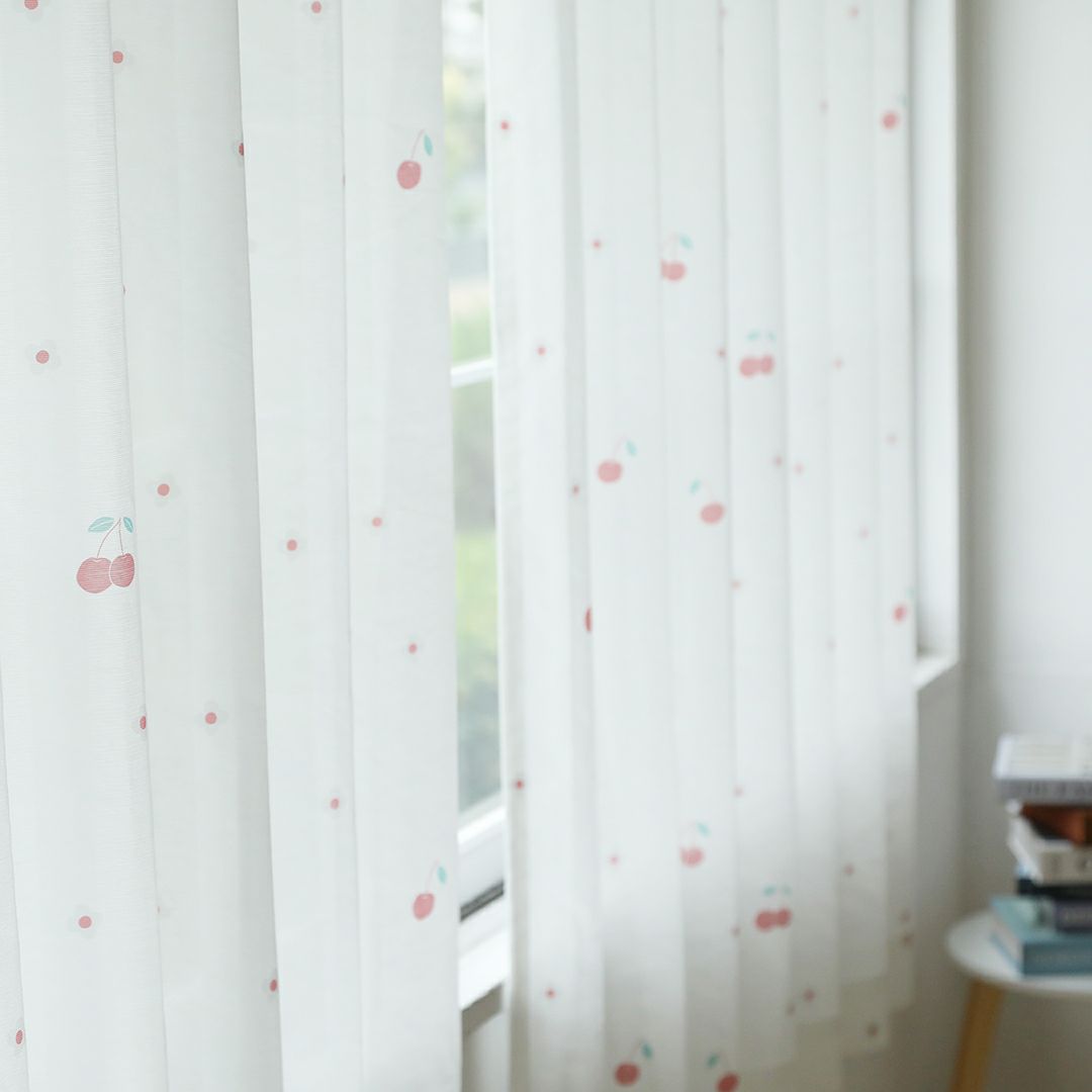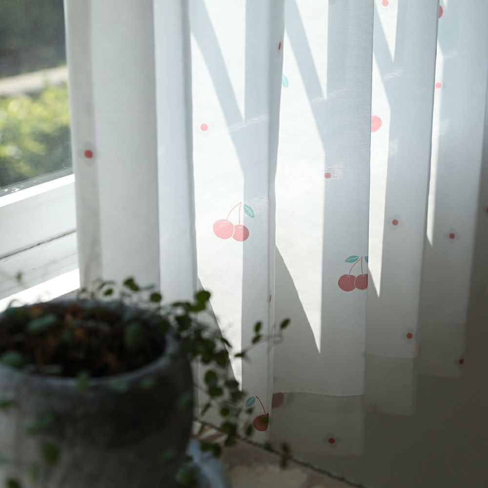 ポップで可愛いチェリーとお花をデザインしました。 リビングなどの大きな窓にはもちろん、小窓や出窓などの小さいサイズの窓にもチェリーの赤が良いアクセントになり、とても可愛く吊っていただけます。 赤系のドレープカーテンとの同色系統一コーディネートや、編みレースカーテンと合わせた、レトロ風コーディネートもおすすめです。 当店デザイナーによるオリジナル柄のため、VENIRC限定の特別なデザインです。 ご家庭での洗濯も可能なため、長く清潔にお使いいただけます。
