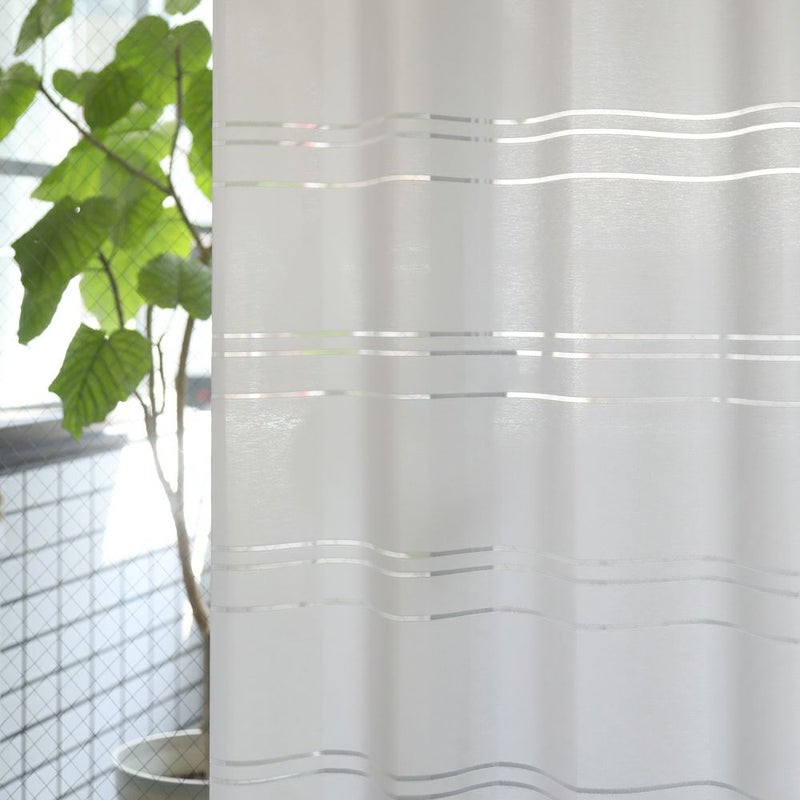 光沢のある薄くて軽い生地に、細いラインが透けて程よくキラッと光が入る爽やかな雰囲気のレースカーテン。
