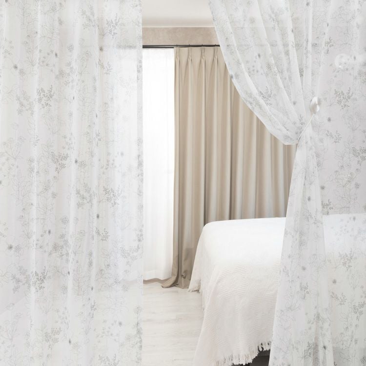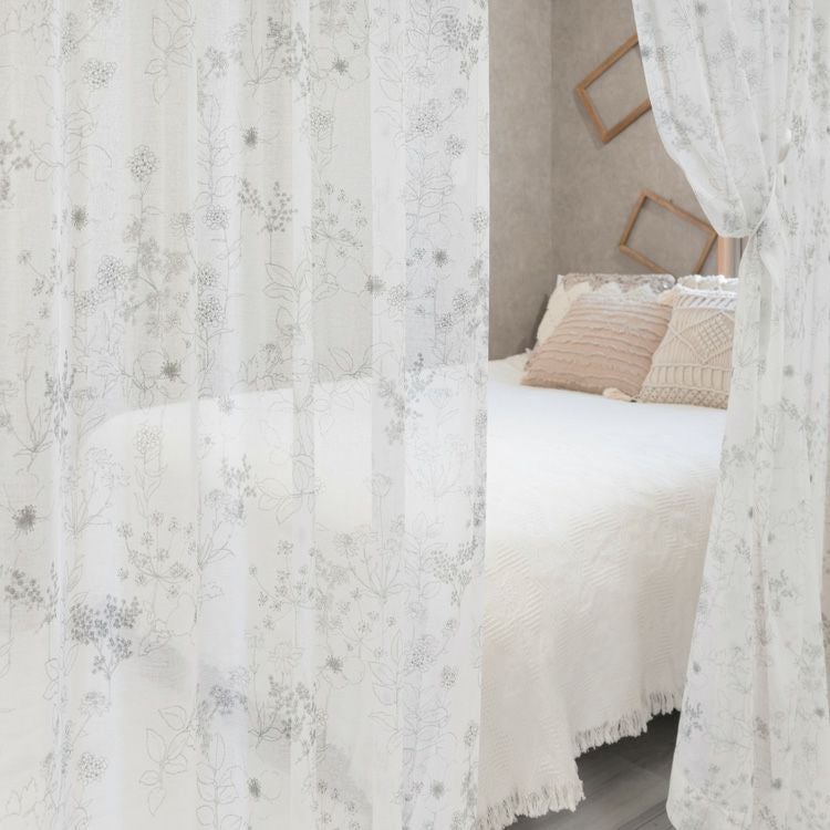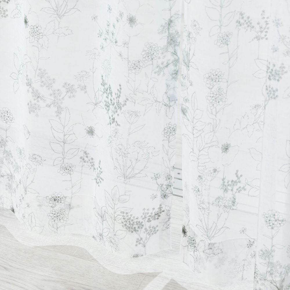 自然な質感の生地の上に繊細な線でデザインされた草花柄レースカーテン。ご家庭での洗濯も可能なため、長く清潔にお使いいただけます。同柄の厚地カーテン【フローラ】と合わせるコーディネートもおすすめ。