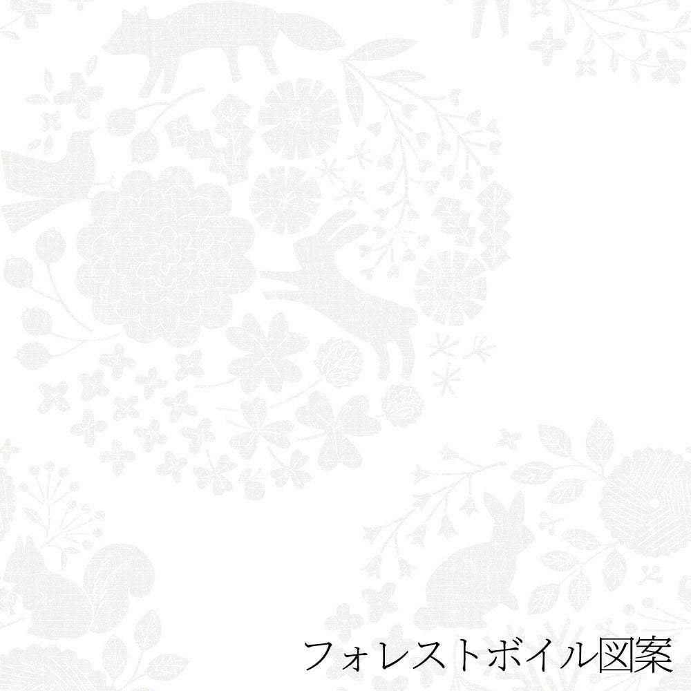 お花でできたサークルの中に小鳥やうさぎ、きつね等の動物たちが隠れています。春の森へ遊びに来たかのような、軽やかな気分をお部屋の中でも。ご家庭での洗濯も可能なため、長く清潔にお使いいただけます。 同柄の厚地カーテン【フォレスト】とのコーディネートもおすすめです。