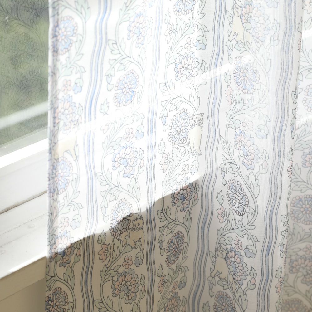 インドのブロックプリント風のデザインに、遊び心を加えたユニークなレースカーテンです。 透ける生地の中に、ひっそりと隠れたネコたちがさりげなく登場し、見るたびに発見の楽しさを感じられます。 あえてにじませたり、ずらした塗りのタッチが手作り風の温もりを感じさせ、日差しが差し込むたびにお部屋を優しく彩ります。 エスニックな雰囲気を持ちながらも、柔らかさをプラスしたデザインです。 同柄の厚地カーテン【カクレニャンコ】とのコーディネートもおすすめです。