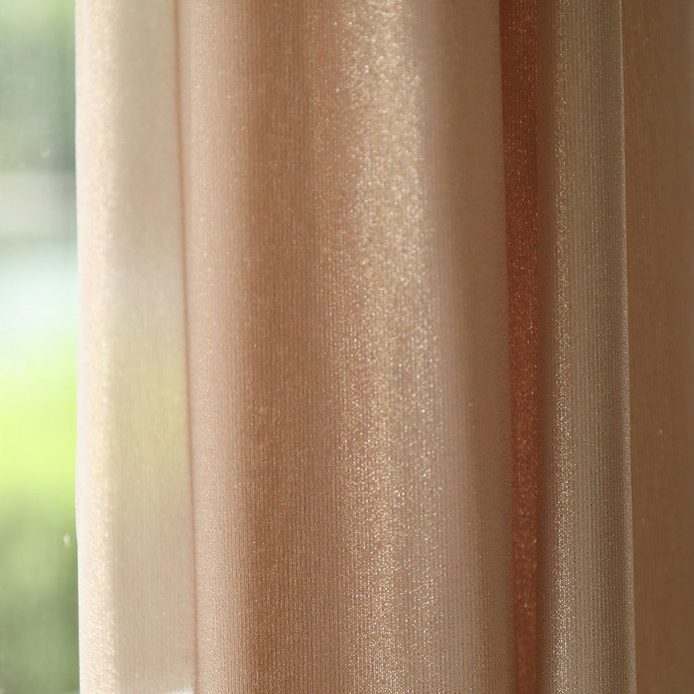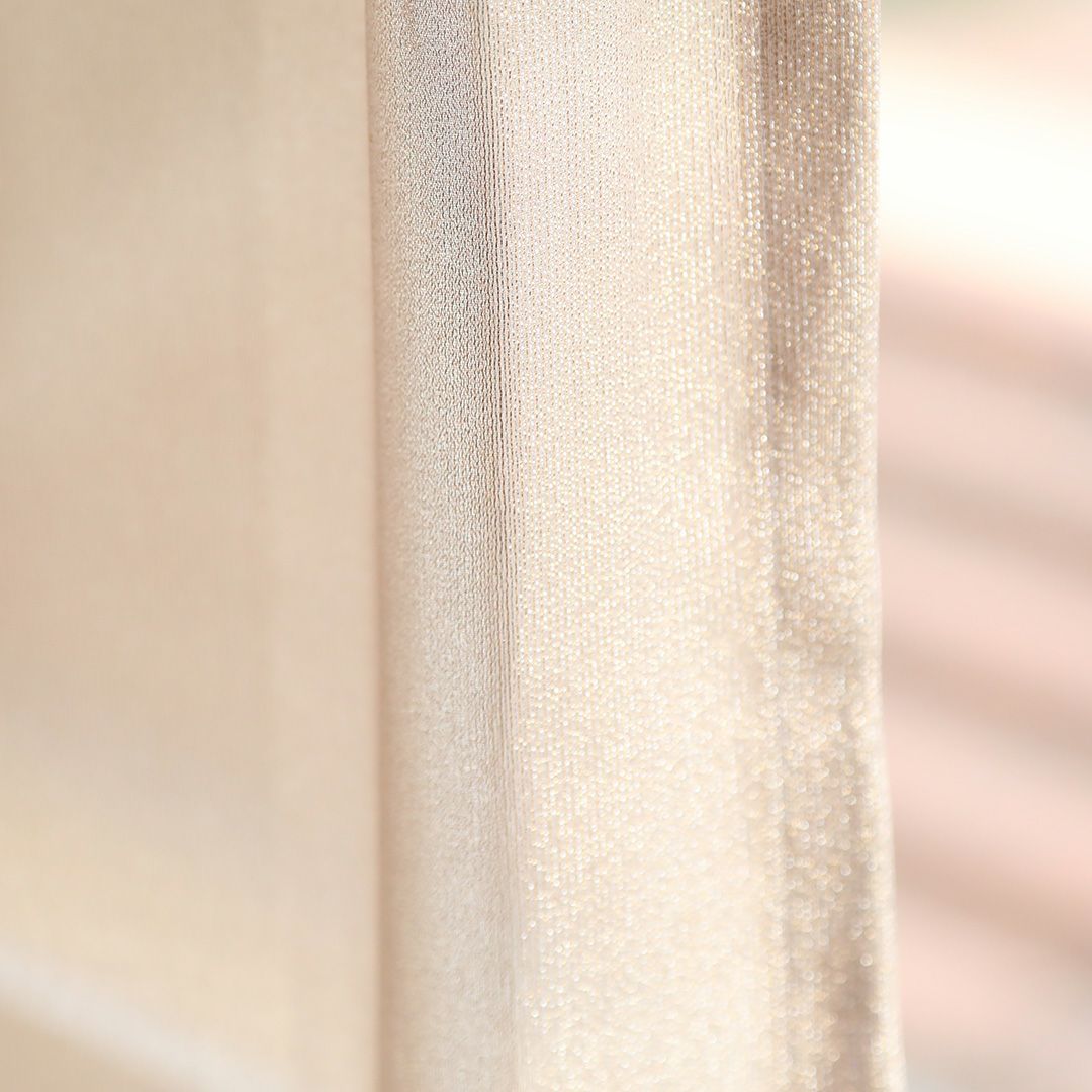 シルバーとゴールドのラメ糸を交互に配列したラメストライプのジョーゼット生地です。 落ち感があり、ドレープ性のある風合いと、ラメの華やかで高級感のある光沢が特徴です。 光に当てるとラメ糸が表情豊かにキラキラと輝きます。 生地は柔らかく、とろみのある質感です。 ご家庭での洗濯も可能なため、長く清潔にお使いいただけます。見る角度や生地の重なりによって異なる様々な表情を、是非お部屋でお楽しみください。