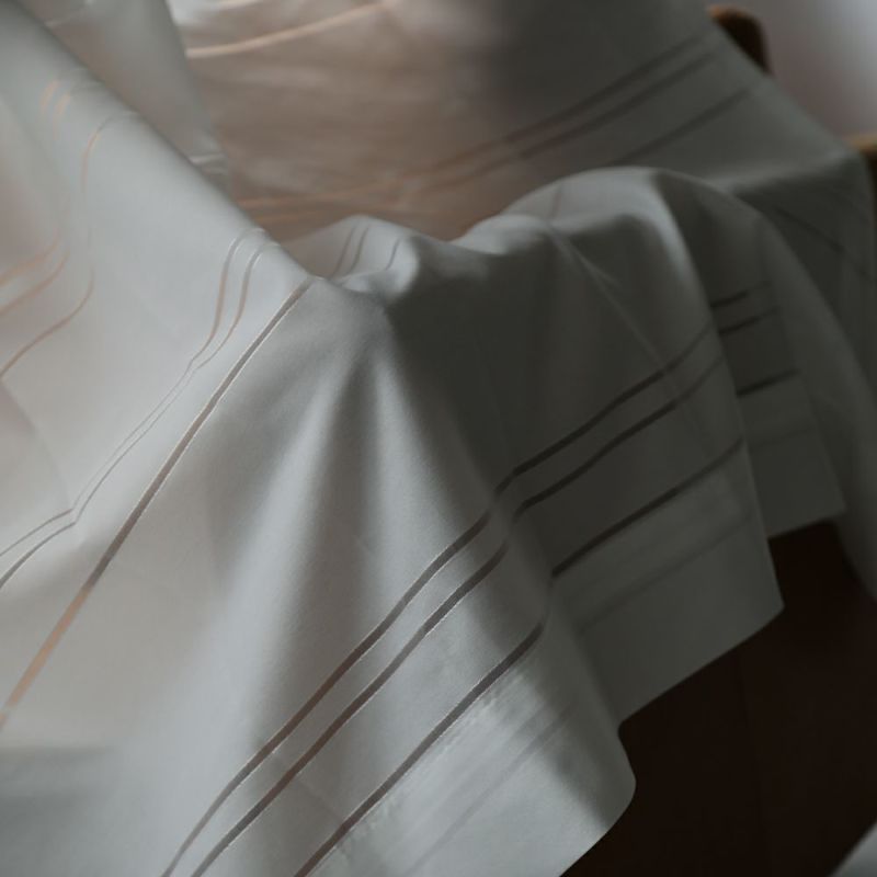 光沢のある薄くて軽い生地に、細いラインが透けて程よくキラッと光が入る爽やかな雰囲気のレースカーテン。