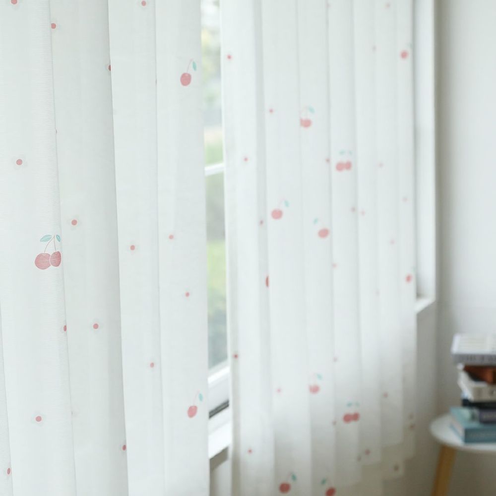 ポップで可愛いチェリーとお花をデザインしました。 リビングなどの大きな窓にはもちろん、小窓や出窓などの小さいサイズの窓にもチェリーの赤が良いアクセントになり、とても可愛く吊っていただけます。 赤系のドレープカーテンとの同色系統一コーディネートや、編みレースカーテンと合わせた、レトロ風コーディネートもおすすめです。 当店デザイナーによるオリジナル柄のため、VENIRC限定の特別なデザインです。 ご家庭での洗濯も可能なため、長く清潔にお使いいただけます。
