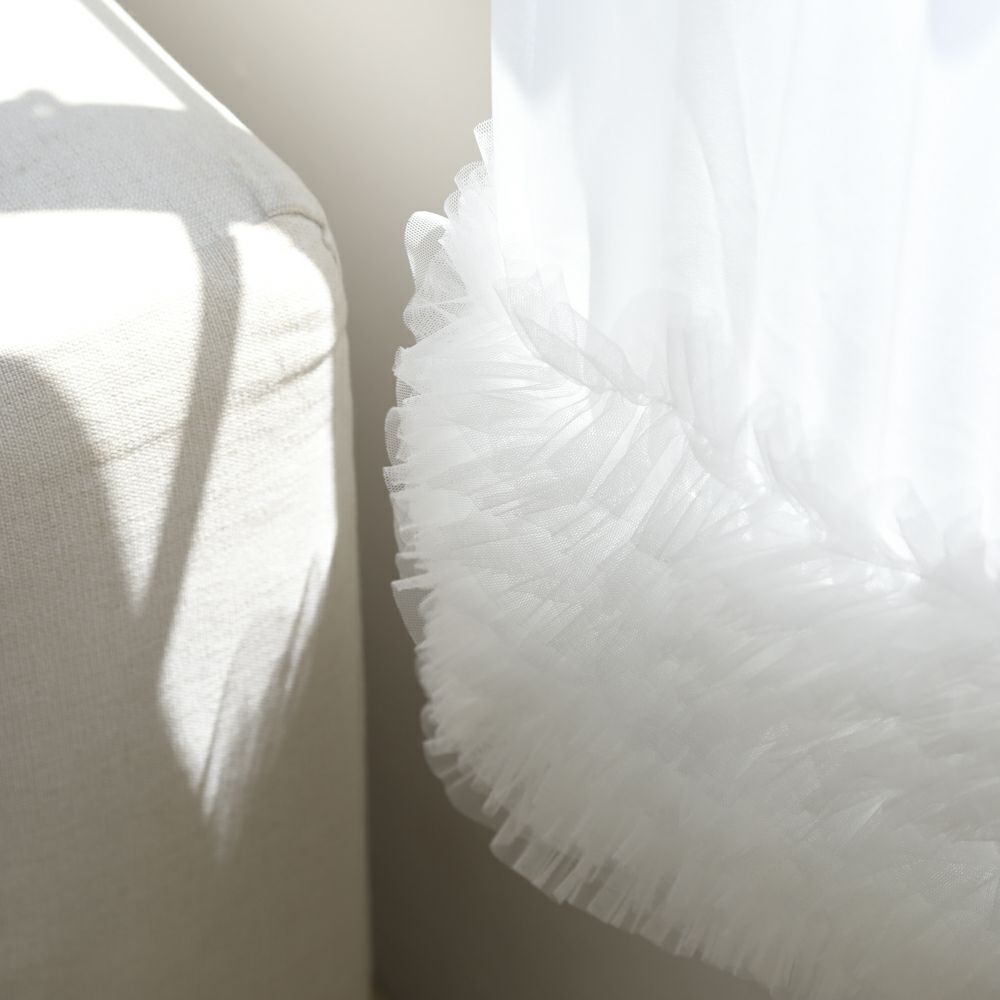 何重にも重なった繊細なフリルが裾をふんわりと彩る、エアリーなレースカーテン。