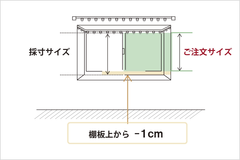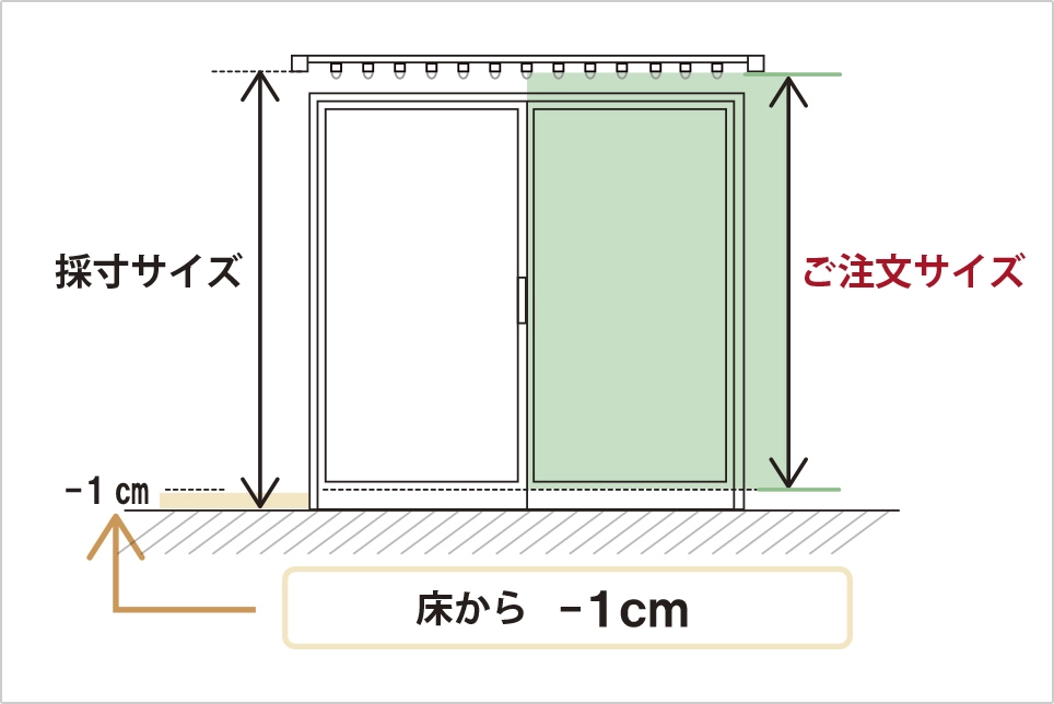 レースカーテンのご注文サイズはドレープカーテンの裾からレースカーテンが見えてしまわないよう、ドレープカーテンの-1cmがおすすめです。