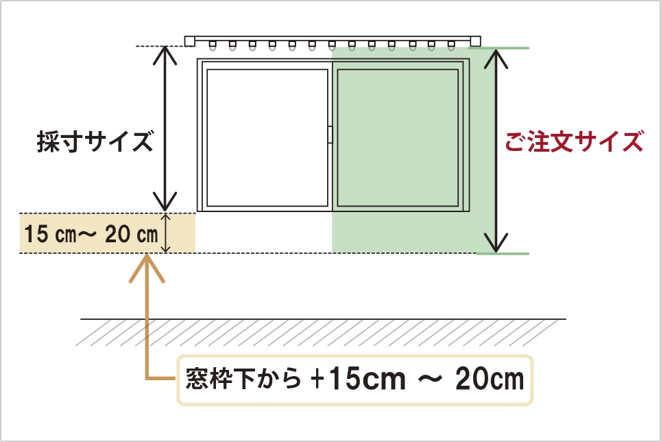 カーテンランナー(穴)の下部から窓枠の下までのサイズを測ります。 斜めに差し込む日差しを遮るため、測った長さ+15cm~20cmでのご注文がおすすめです。