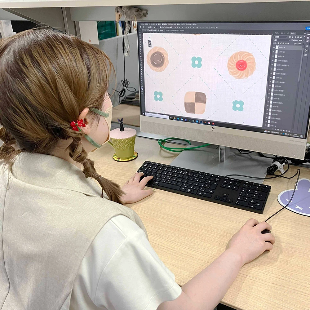 パソコン上でデザインしたものをいざ実際の生地にプリントしてみると、思った以上に色や柄が違うように見え、理想の仕上がりに持っていくまでにはかなり時間がかかりました。