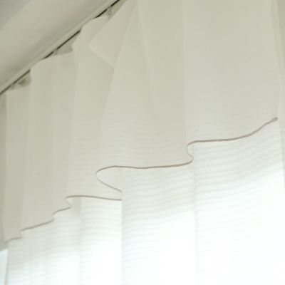 二重になっておりかわいいですが、カーテンフックがよくある普通のカーテンとは違うので思ってたイメージにはならなかったです。カーテンレールがもっと高い位置か天井付けだった場合、理想に近かったかもしれません。たゆませるために30%長めにオーダーしましたがたゆみが甘くもっと長めにオーダーすれば良かったと思います。